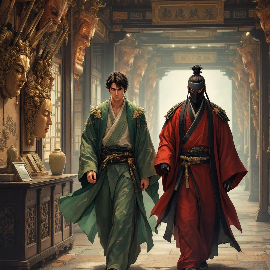 Ils traversèrent les couloirs du palais en silence, l'odeur lourde de l'encens se mêlant à celle, faible, du bois laqué. Les masques complexes qui tapissaient les murs arboraient des expressions de malice, de moquerie et de menace. Le clan du Scorpion aimait rappeler à ses invités que la tromperie était une forme d'art.