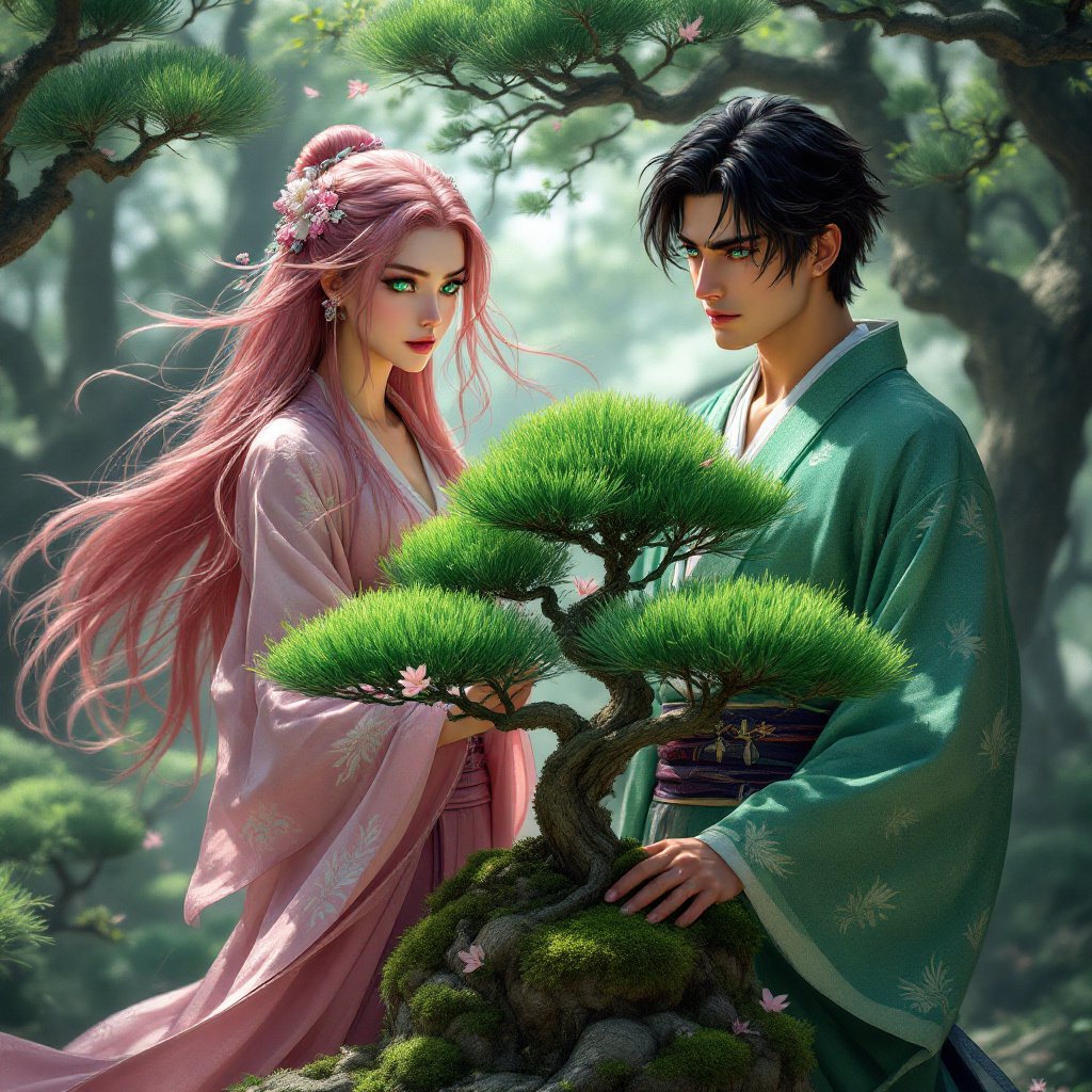Au détour d’un sentier Iwamori et Tenzen virent une jeune samouraï assise sur un banc de bois occupée à lire un parchemin. D’un pas toujours plus décidé Iwamori se dirigea vers la jeune femme. Elle était vêtue d’un somptueux kimono rose aux motifs délicats de fleurs de cerisier. Ses longs cheveux roses flottaient au gré d’une brise légère, contrastant avec la pureté éclatante de ses yeux verts, lumineux comme des émeraudes. Elle porta son regard, profond et mystérieux, sur Iwamori approchant et prit la parole sans se même lever: “J’ai failli attendre” fit-elle d’un ton désinvolte et agacé. Arrivé à hauteur, Iwamori regarda son compagnon et déclara d’un ton froid: “Isawa Tenzen…” il tourna la tête vers la jeune femme, “Soshi Namio”. Ignorant totalement la présence d’Iwamori, celle-ci se leva aussitôt et saisit le bras de Tenzen en s’exclamant “Quel plaisir de vous rencontrer cher Daimyo du clan de la Chouette! Nul besoin de formalité entre nous appellez-moi Namio.” Les choses étaient allées un peu vite pour Tenzen qui bredouilla une banalité tandis que Namio l'entraînait par le bras dans une allée des jardins. Elle commença à lui parler de jardins, elle semblait connaître chaque sentier chaque fleur, Tenzen qui adorait les plantes avait étudier la botanique et l’horticulture artistique : “Ce pin a été taillé par un maître du niwaki (Note: technique traditionnelle)” fanfaronna-t-il, ”la silhouette noble se marie parfaitement avec les subtiles touches de mousse, quelle harmonie entre robustesse de l’arbre et la fragilité du koké (note: type de mousse japonaise).” Soshi Namio vérifia du regard que personne ne pouvait écouter leur conversation puis posa des yeux intenses sur Tenzen. “Tu t’imagines avoir le niveau pour jouer dans la cour de Bayushi?” déclara-t-elle sur un ton devenu soudain menaçant, “Laisse moi te raconter une petite histoire” “Il était une fois un petit chevreau qui avait bien travaillé à l’école. Pour le récompenser, le roi des chèvres l’invita à se choisir un territoire dans la prairie pour y élever sa famille et faire plein d’autres petits chevreaux bien travailleurs. Le chevreau décida alors de se rendre sur le territoire des loups et demanda audience avec le chef de la meute. Connais-tu la fin de ce conte? ”
